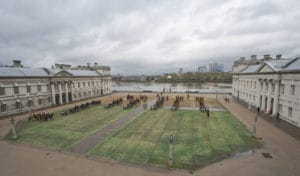 Scenes for the block-buster musical Les Misérables had just been filmed at the Old Royal Naval College. The grass was in a sorry state and had to be painted green before the Queen was driven through the grounds in her Range Rover.