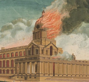 Disaster struck on 2 January 1779. The Annual Register for 1779 described what happened: ‘At six o’clock in the morning, a dreadful fire broke out at Greenwich Hospital, which burnt most furiously. At ten o’clock the chapel (the most beautiful in the kingdom) .. [was] entirely consumed’.