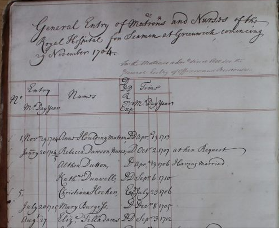The Nurses Entry Book held at The National Archives at Kew records the names of them all and the photographs here show the first and last admissions. Between November 1704 when Anne Houlding was appointed Matron until the last nurse, Harriet Henty, arrived in 1864, 1,536 women in total were employed. The records describe the uniforms they wore and detail their duties and the rules governing their conduct. It is disappointing, although perhaps not surprising, that we have yet to discover a single image of a nurse in any of the many paintings, etchings and cartoons that picture the Greenwich Pensioners and the palatial buildings that were developed to house them.